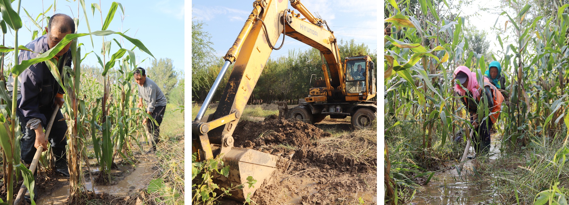 抢收玉米,排涝先行。面对田间积水难题,博华第一时间成立排涝队伍,制定“分片负责”方案。员工们手持工具对原有沟渠清淤疏通,同时开挖临时排水沟,最终形成“主沟+支沟+毛沟”的立体排水网络,为后续人员与机械进场扫清障碍。
